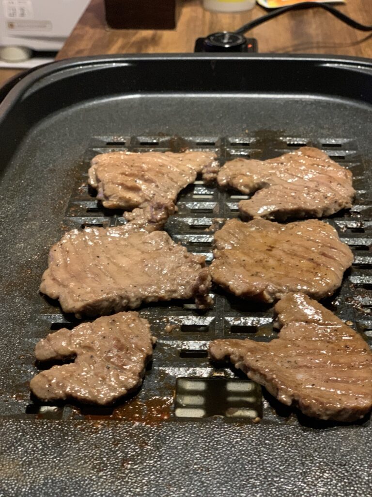 今日はお昼で仕事が終わったので、ふるさと納税の牛タンを焼いて、子どもと一緒に肉巻きおにぎりを作りました。
